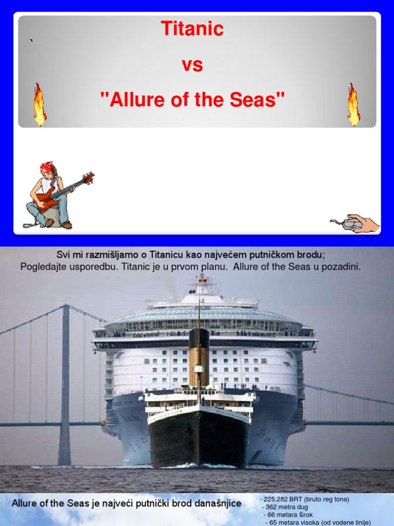 The Titanic Vs The Biggest Ship In The World 9gag from images-cdn.9gag.com Many even consider regent seven seas explorer to be far more luxurious than any ship of the titanic had style to be sure, but there's no comparing it to the modern designs in terms of luxuries. She has 16 passenger decks compared to titanic's 9. Promotional video for the royal caribbean allure of the seas with titanic music. Discover the vessel's particulars, including capacity, machinery, photos and ownership. A ticket for titanic third class passage cost between £3 and £8. Titanic je u prvom planu. Judged by gross tonnage, which is a measure of the volume of the ship rather than the weight, the ms allure of the seas at 225,282 gt is almost five times larger than the titanic, at 46,328 grt. Collinmorrison, you are right modern day cruise ships did not become significant larger than the titanic until the sister ships, oasis of the seas and allure of seas were launched by royal caribbean cruise line recently.